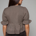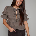 The soft bow at the front adds a touch of whimsy, while the peplum silhouette gracefully highlights your waist, creating a flattering shape for any occasion.