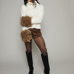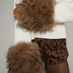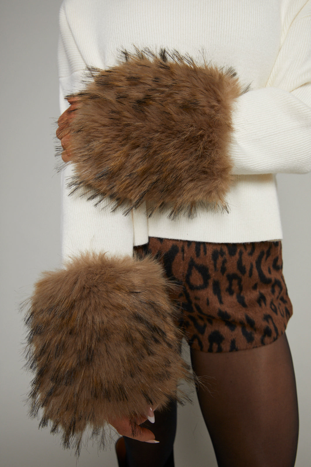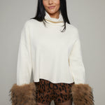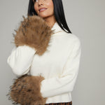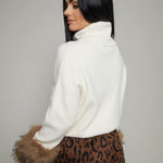 - Mid-weight ribbed knit sweater fabric - Turtleneck design - Long sleeves - Faux fur detail cuffs