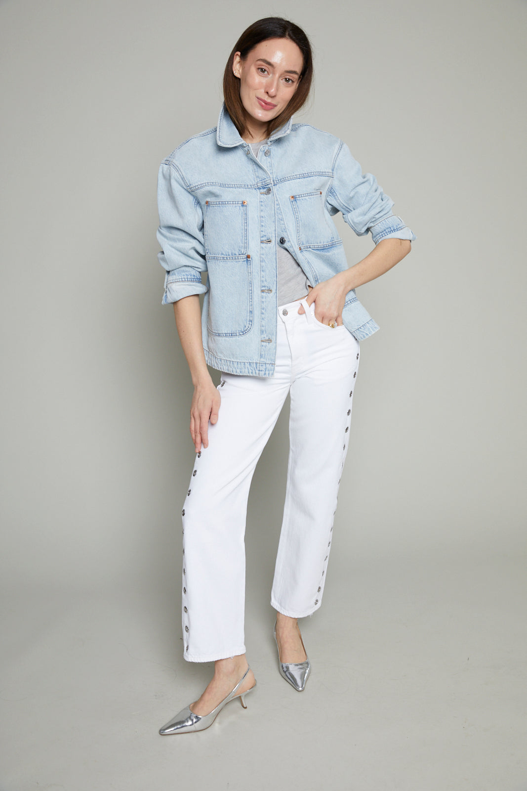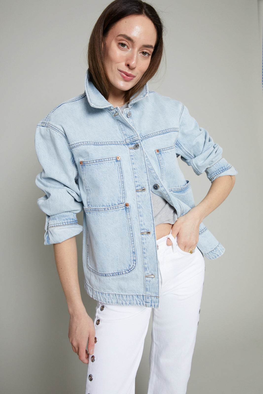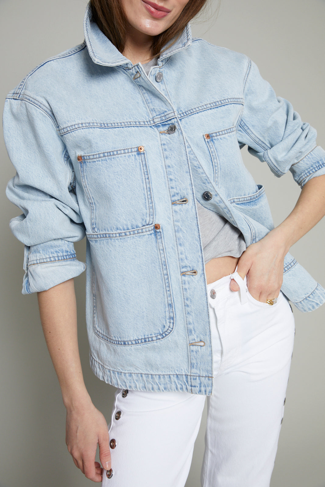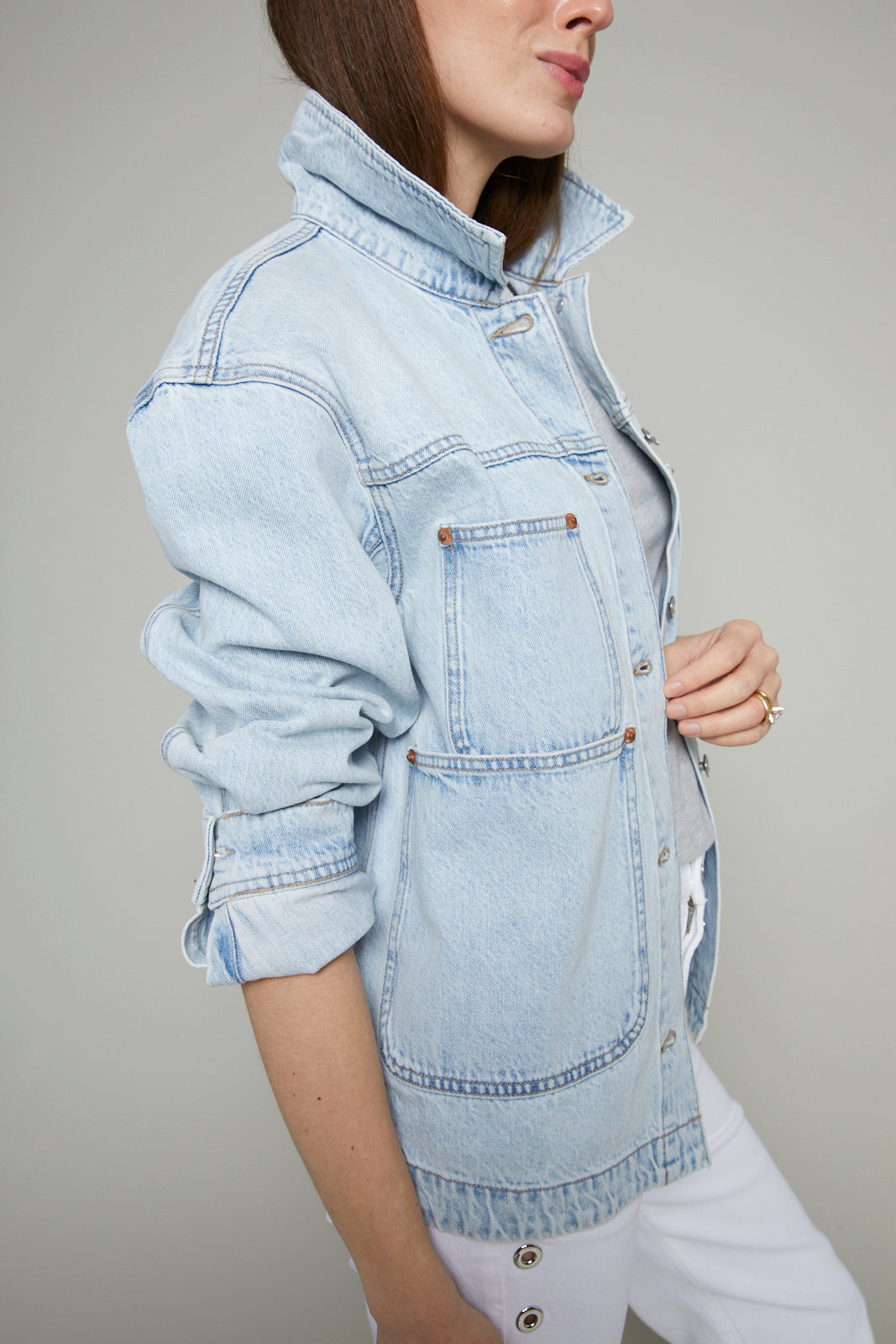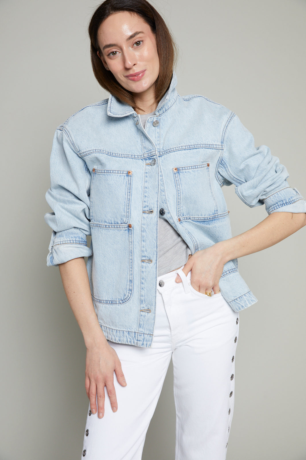 Designed for modern utility, Banks reinterprets the classic chore jacket through a modern lens. The structured silhouette features outer pockets and a clean, polished fit in 100% non-stretch cotton denim with an authentic texture that effortlessly layers over everyday staples.