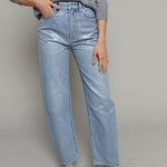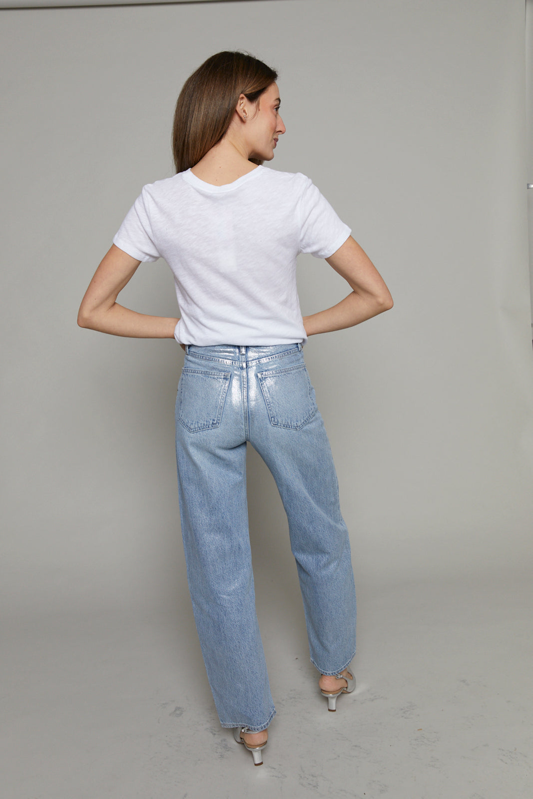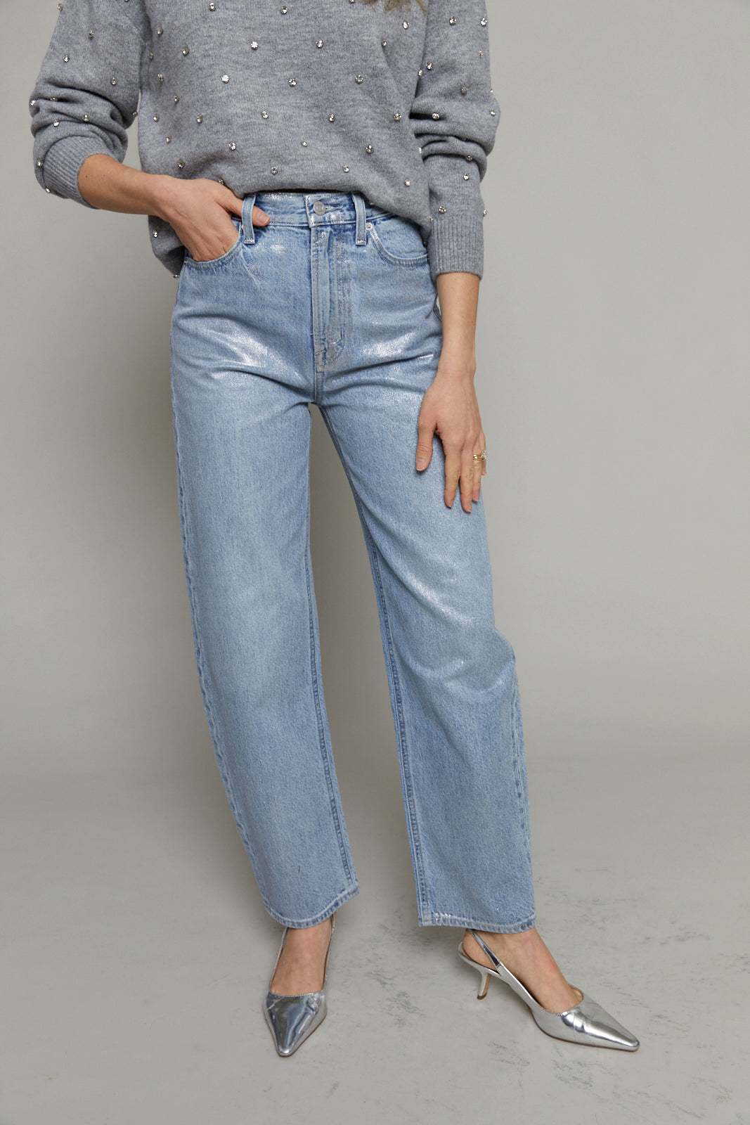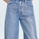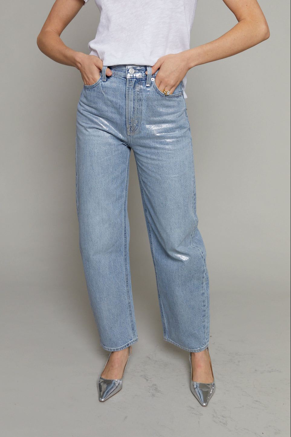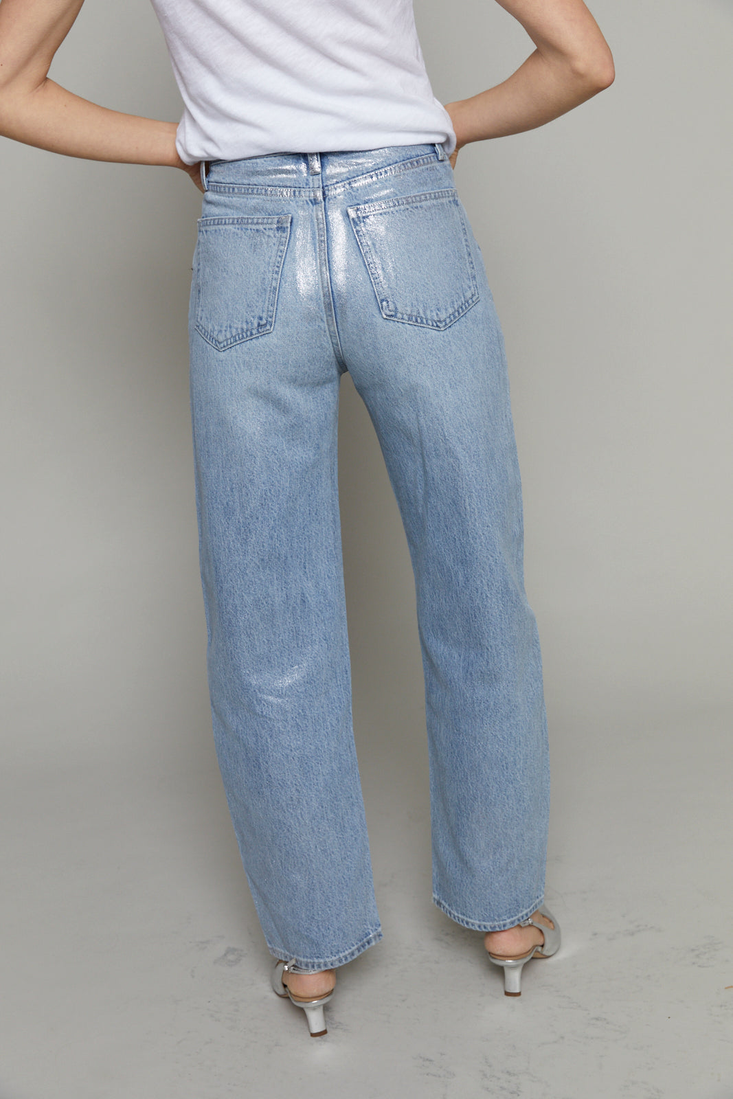 The best-selling jean that redefines modern denim. Blake sits at a flattering high rise with a stylish barrel leg silhouette and full-length 30" inseam that creates sophisticated drama. Clean hem finishes add polished detail to the contemporary silhouette. Crafted from our premium rigid non-stretch denim in Spellbound, a captivating light blue wash with a luminous sheen that catches the light beautifully. Finished with a branded metallic patch on the back that adds signature shine.