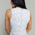 This sleeveless mini dress features delicate floral lace overlay in soft blue and white tones. Designed with a fitted silhouette, round neckline, and back zipper closure, it offers an elegant and polished look perfect for any daytime event or night out. - Floral lace overlay fabric - Sleeveless fitted silhouette - Round neckline detail - Hidden back zipper closure - Fully lined for comfort