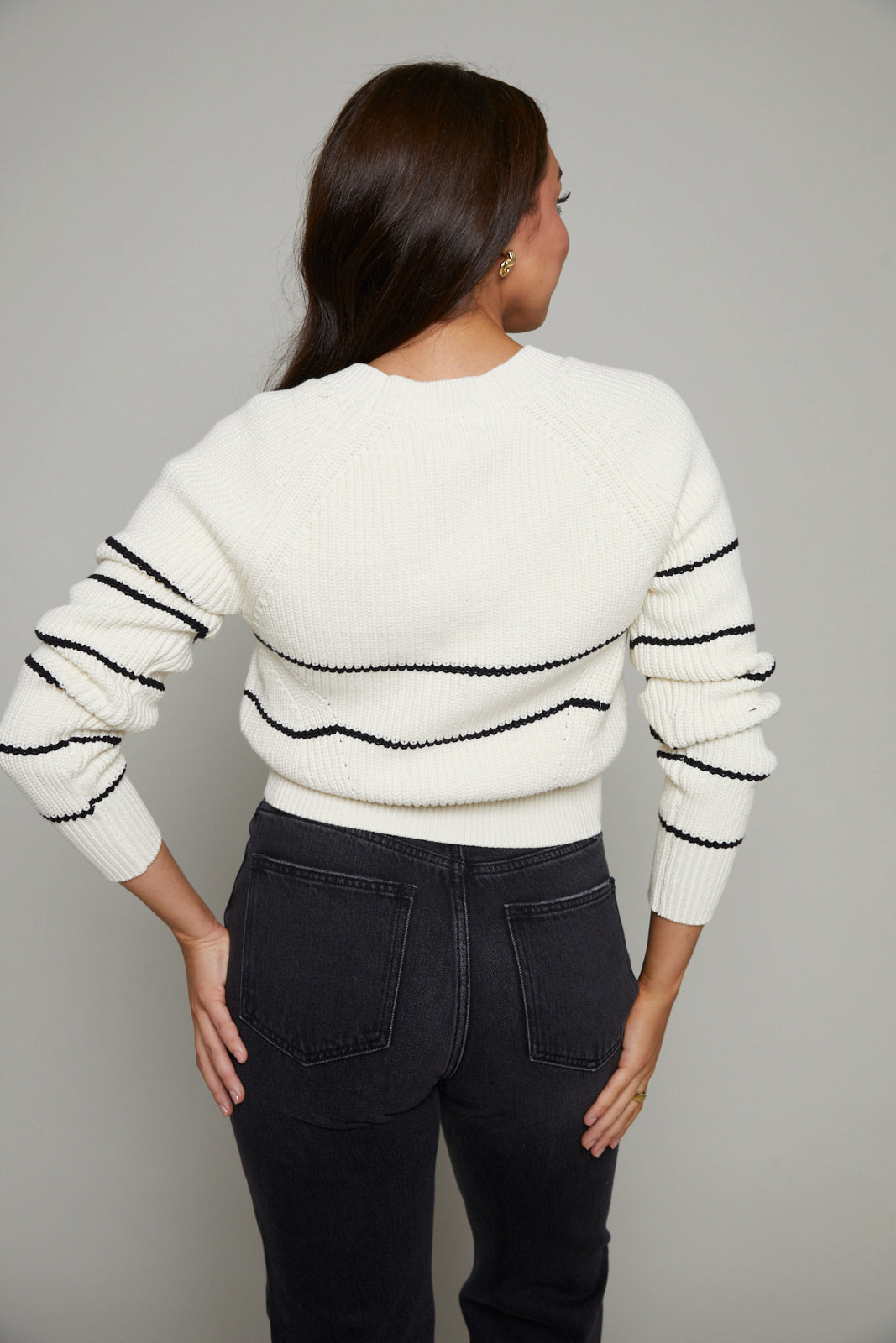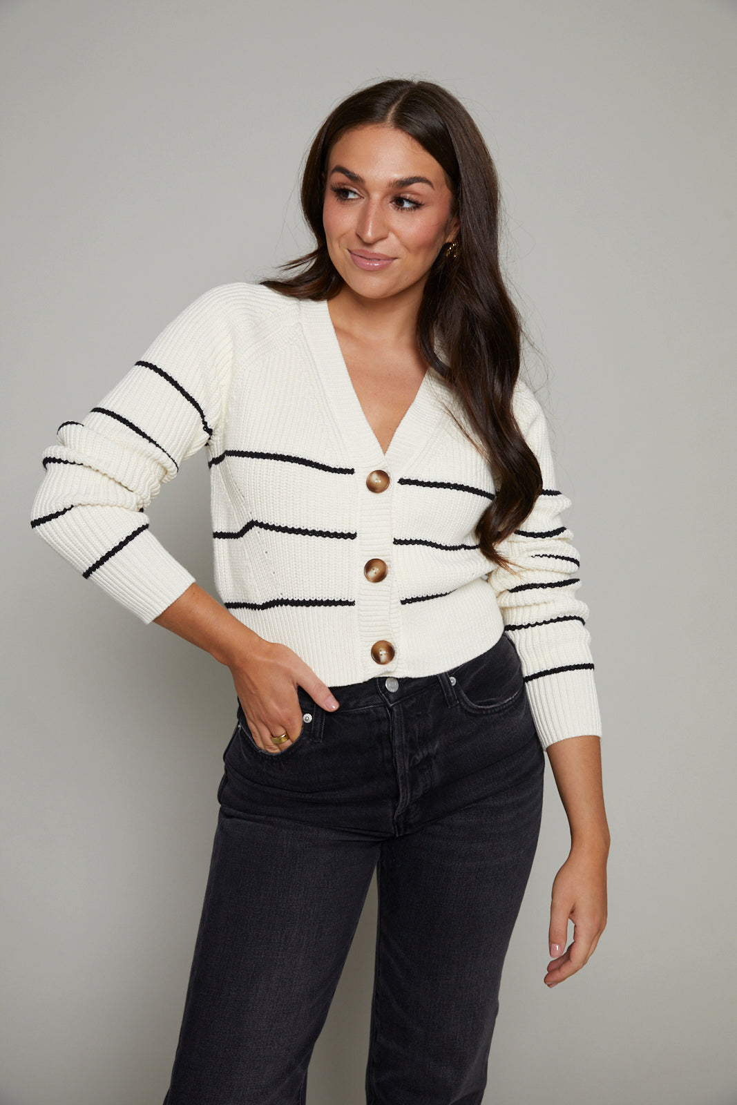 This fitted cropped cardigan is equal parts cozy and cool, thanks to its yarn-dyed stripes and sweater-knit texture. The deep v-neck and button-front design make it easy to wear solo or layered over.