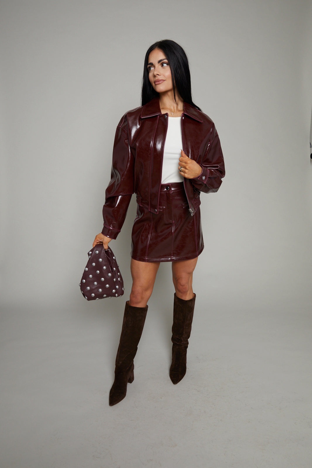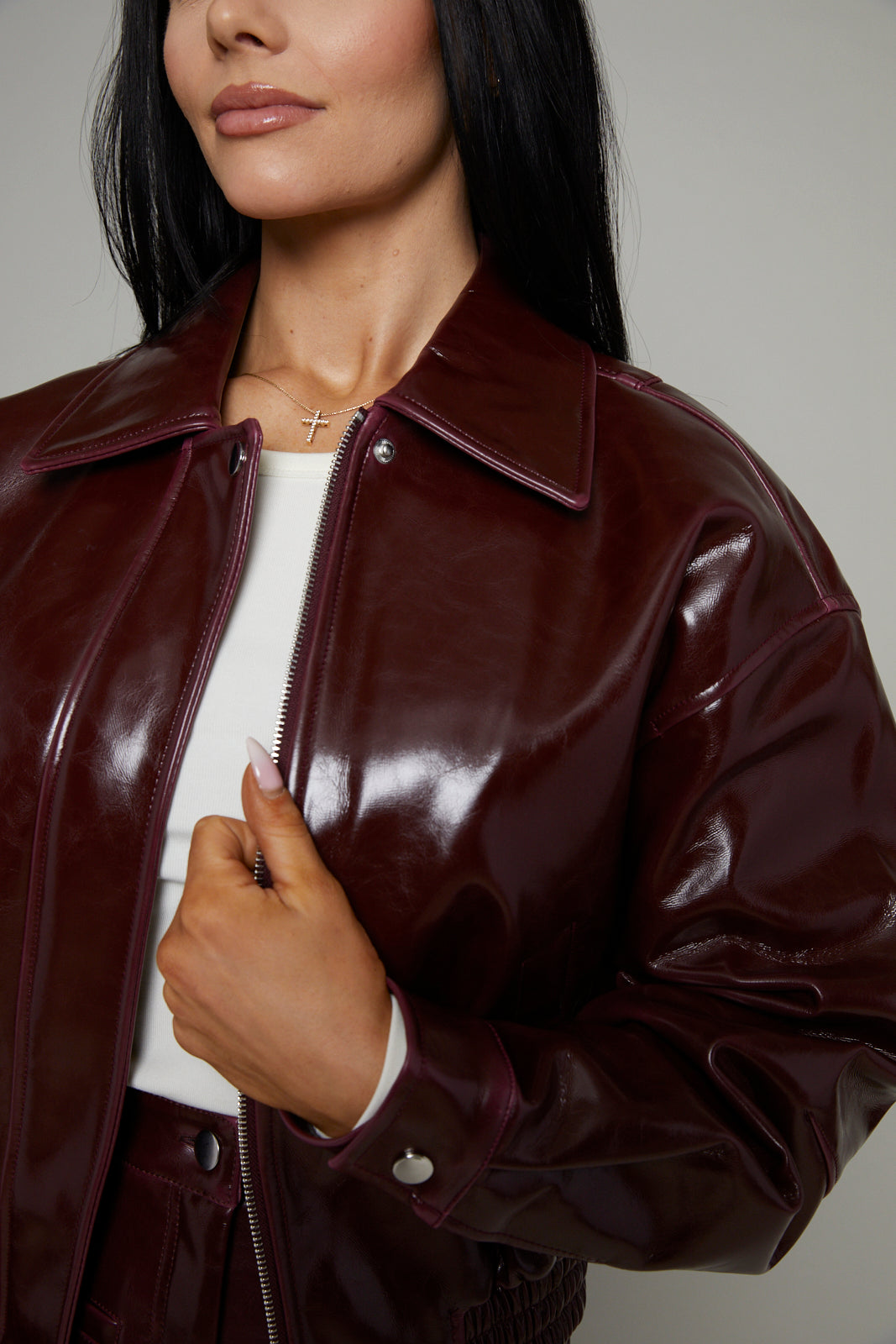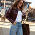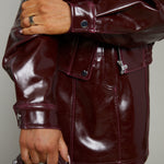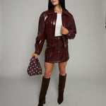 Eliza Faux Vinyl Leather Bomber Jacket - Bordeaux
