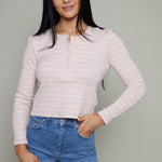 Subtle stripes and soft rib texture make this fitted henley feel timeless.