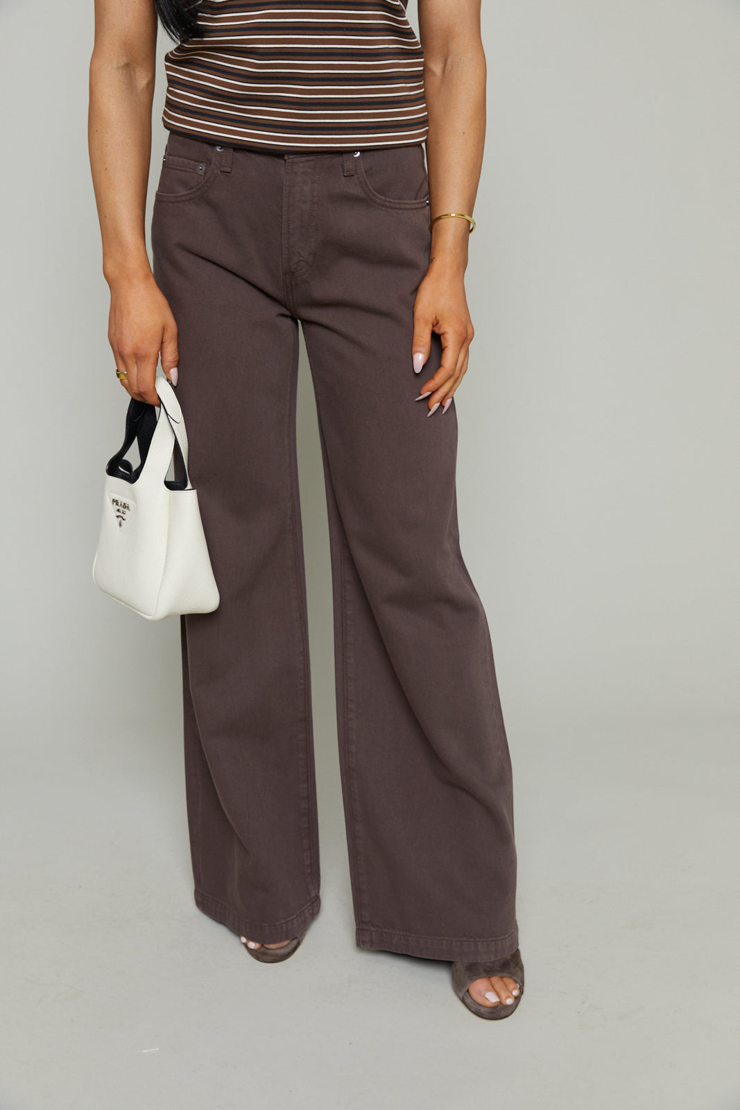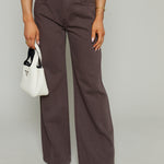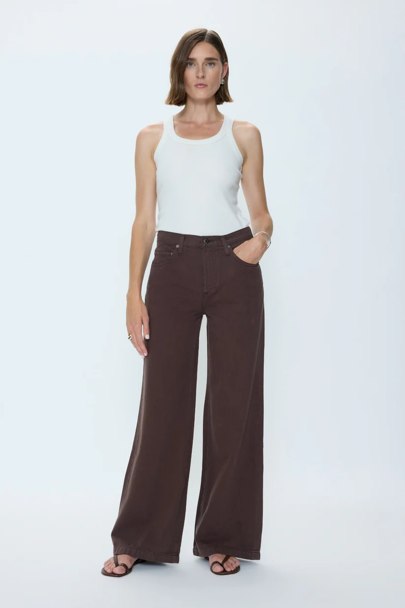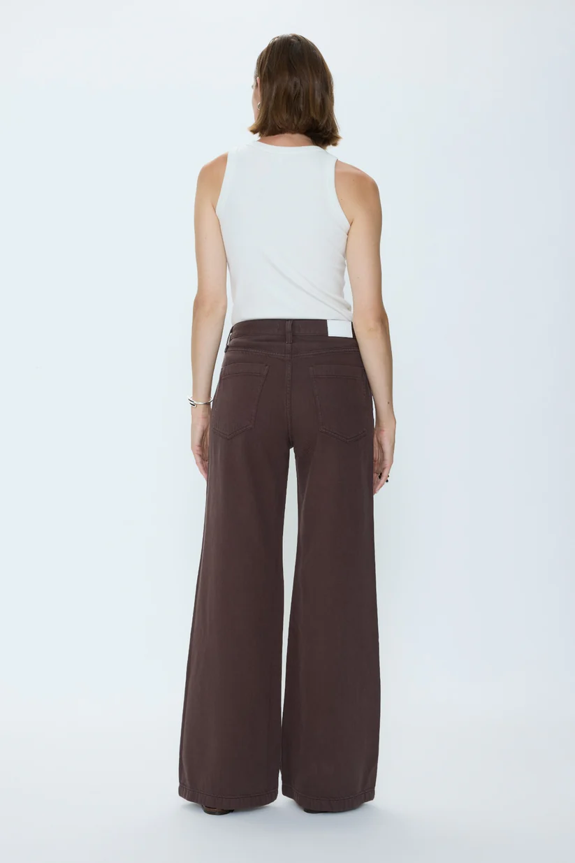 Cut to sit low on the hips, Jenna reintroduces the palazzo silhouette with a relaxed rise and a wide, fluid leg. The 32" inseam creates a long, elevated drape that makes them feel modern. Constructed from non-stretch denim that balances structure and movement, the neutral brown shade gives them an understated polish.