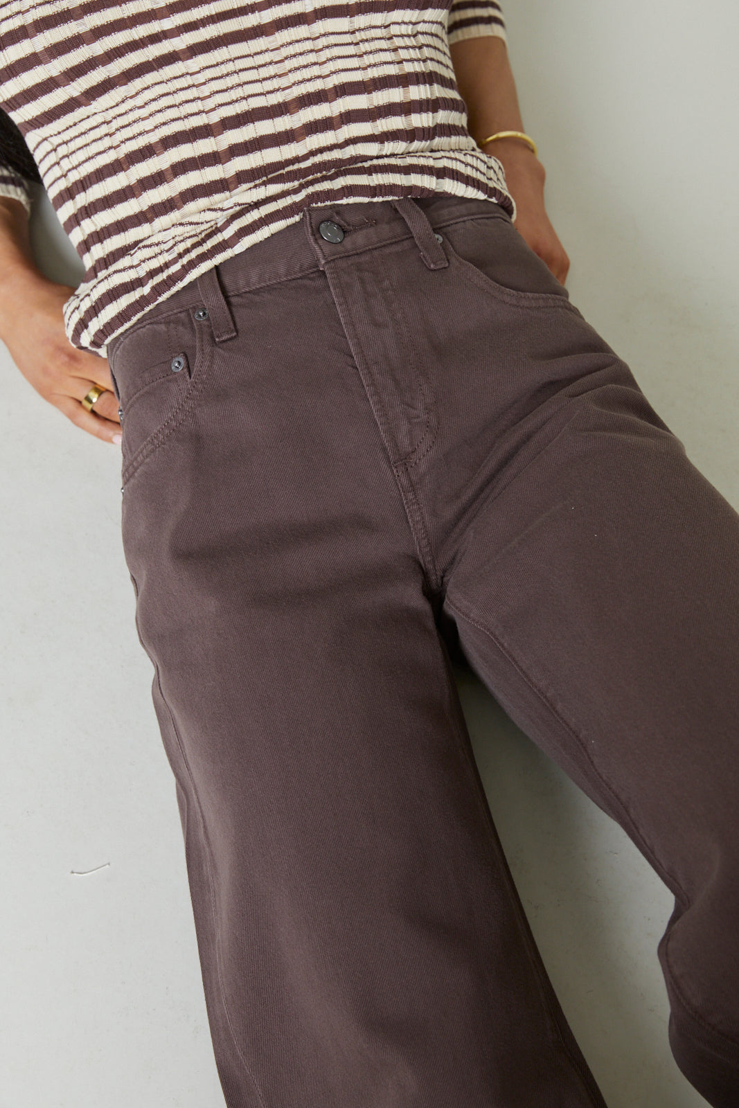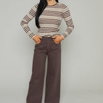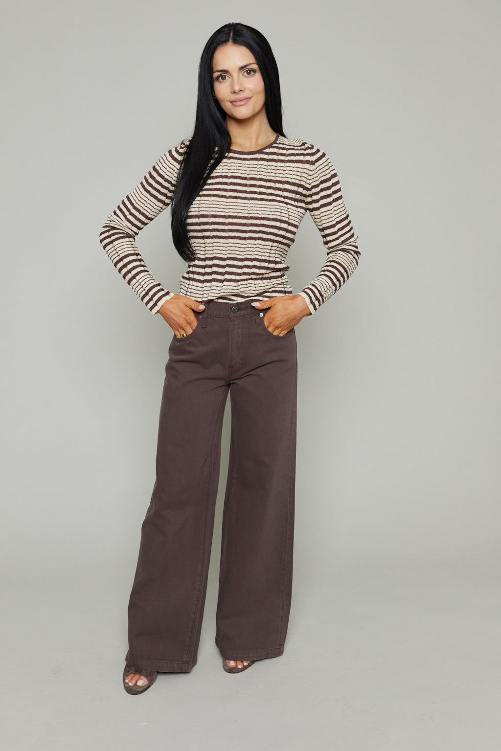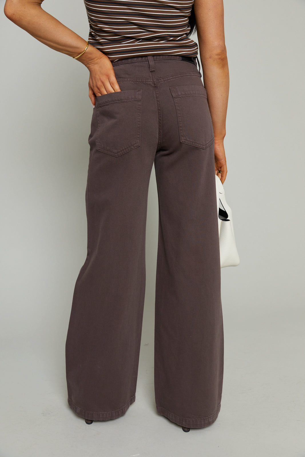 Cut to sit low on the hips, Jenna reintroduces the palazzo silhouette with a relaxed rise and a wide, fluid leg. The 32" inseam creates a long, elevated drape that makes them feel modern. Constructed from non-stretch denim that balances structure and movement, the neutral brown shade gives them an understated polish.