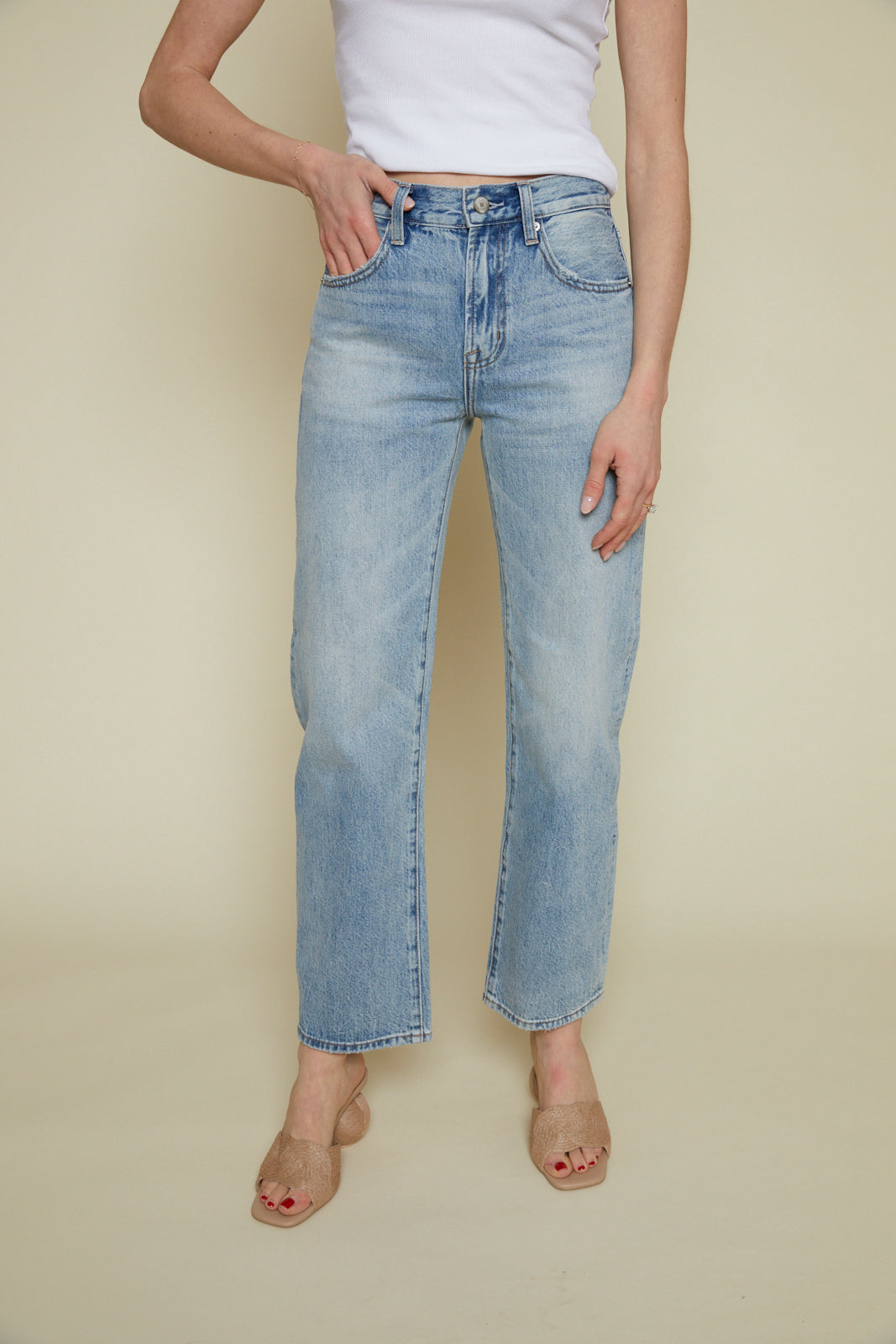 If you're looking for the perfect jean you can wear on daily basis, then you're at the right place. The Kirby is our newest straight leg, but with a special touch - she has a slight bowed shape on the inside of the legs for an elongated, slimming look throughout the entire fit. In an ultra cool vintage light wash with gentle fading around the knees and thighs, this is he fit of the season.