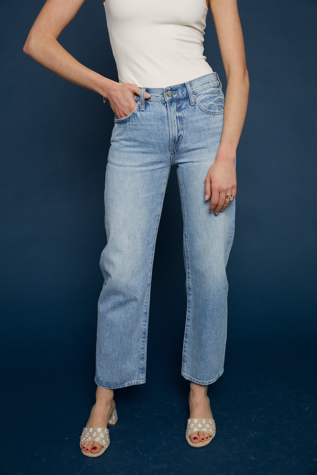 Mid-rise, with a straight leg that bows at the knees for an arched, barrel leg silhouette. Ankle length crop with a clean hem.