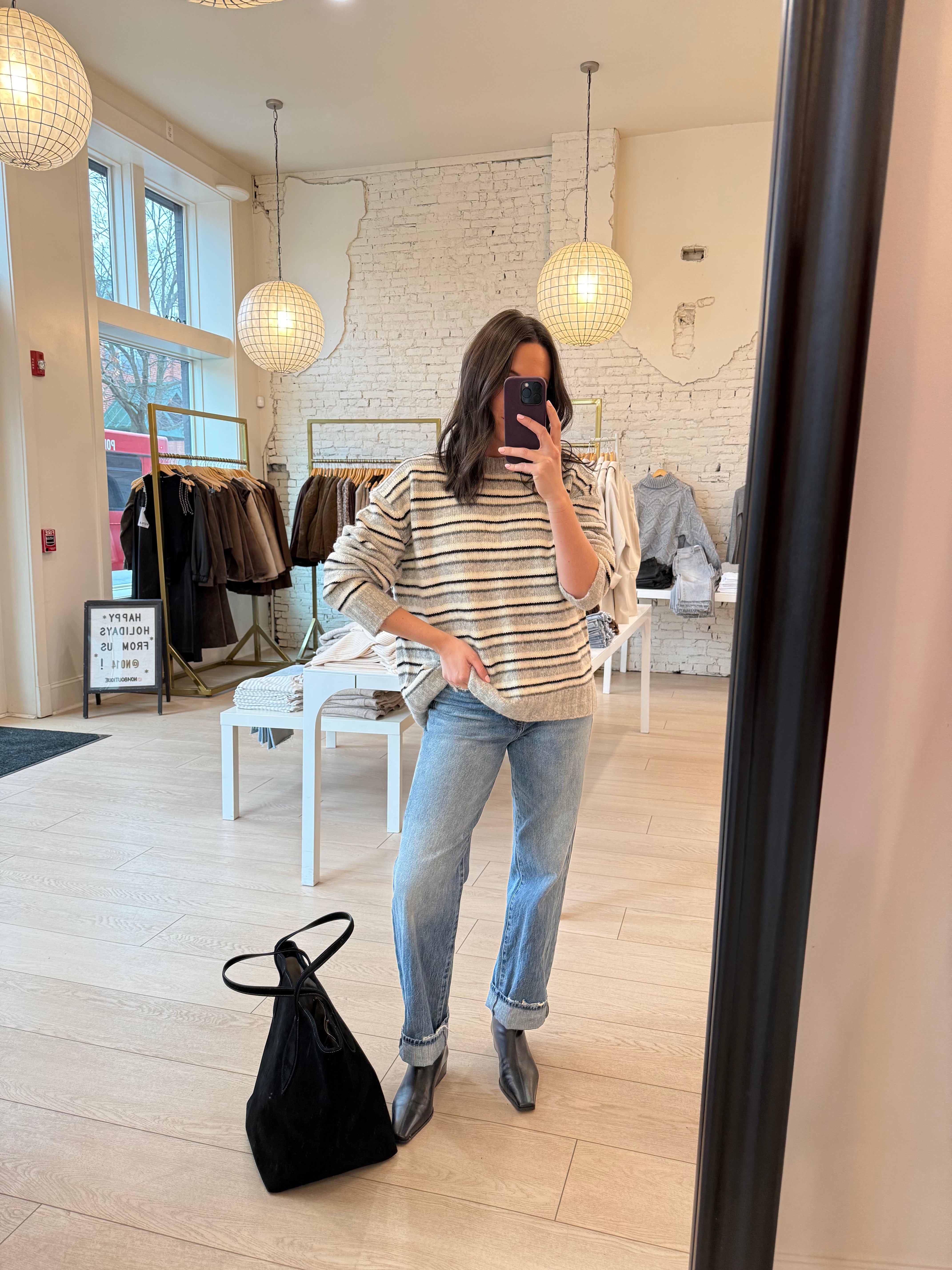 A modern essential, Marina features an oversized fit that drapes effortlessly while maintaining its shape for a balance of comfort and structure. Knit from a wool-cotton blend, it’s soft yet substantial—perfect for layering or wearing solo. Variegated stripes in Grey White bring subtle texture and a graphic, contemporary finish.