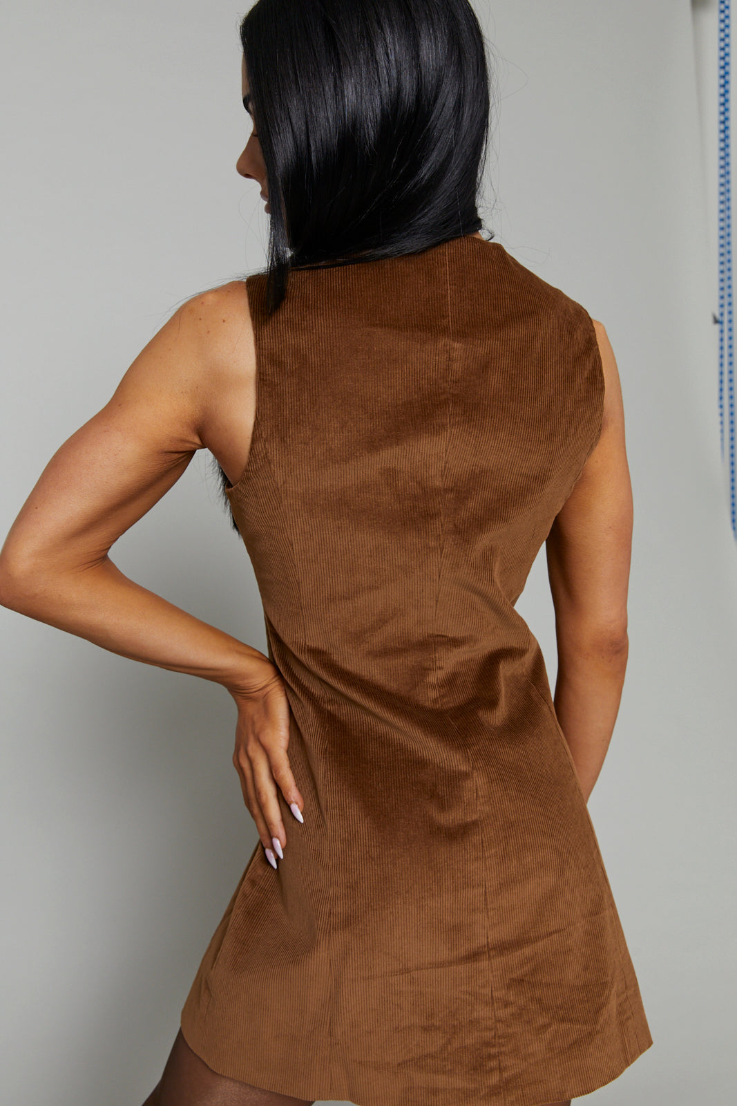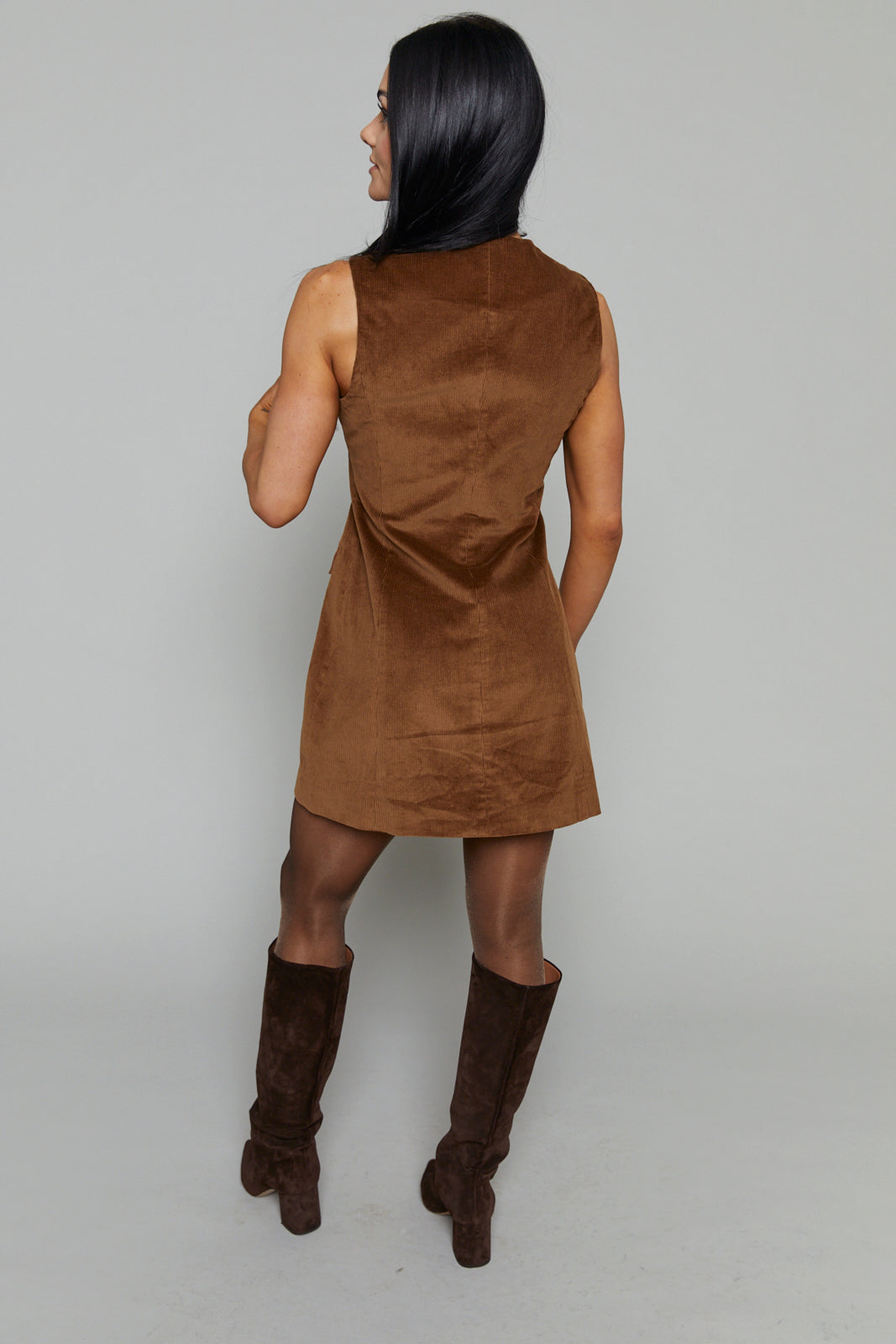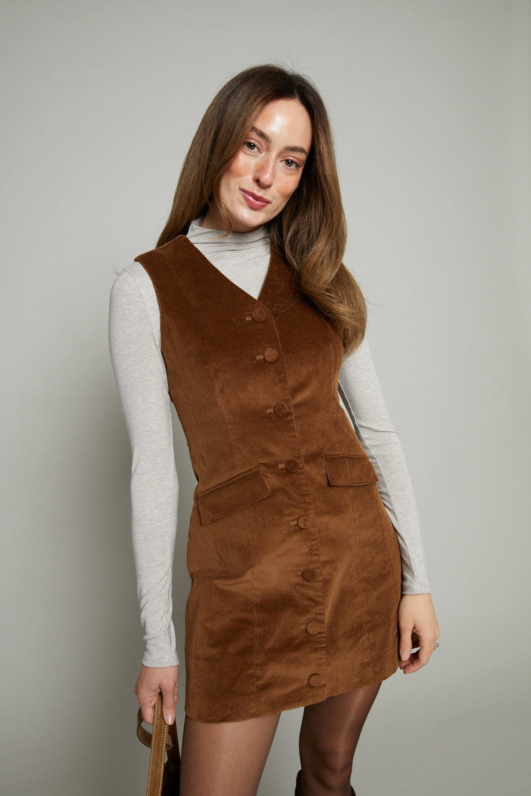 A playful mini corduroy design in the perfect camel shade for fall! Its sleeveless vest-style top and v-neckline create a relaxed, easygoing vibe, while the button-down front adds a touch of classic charm.