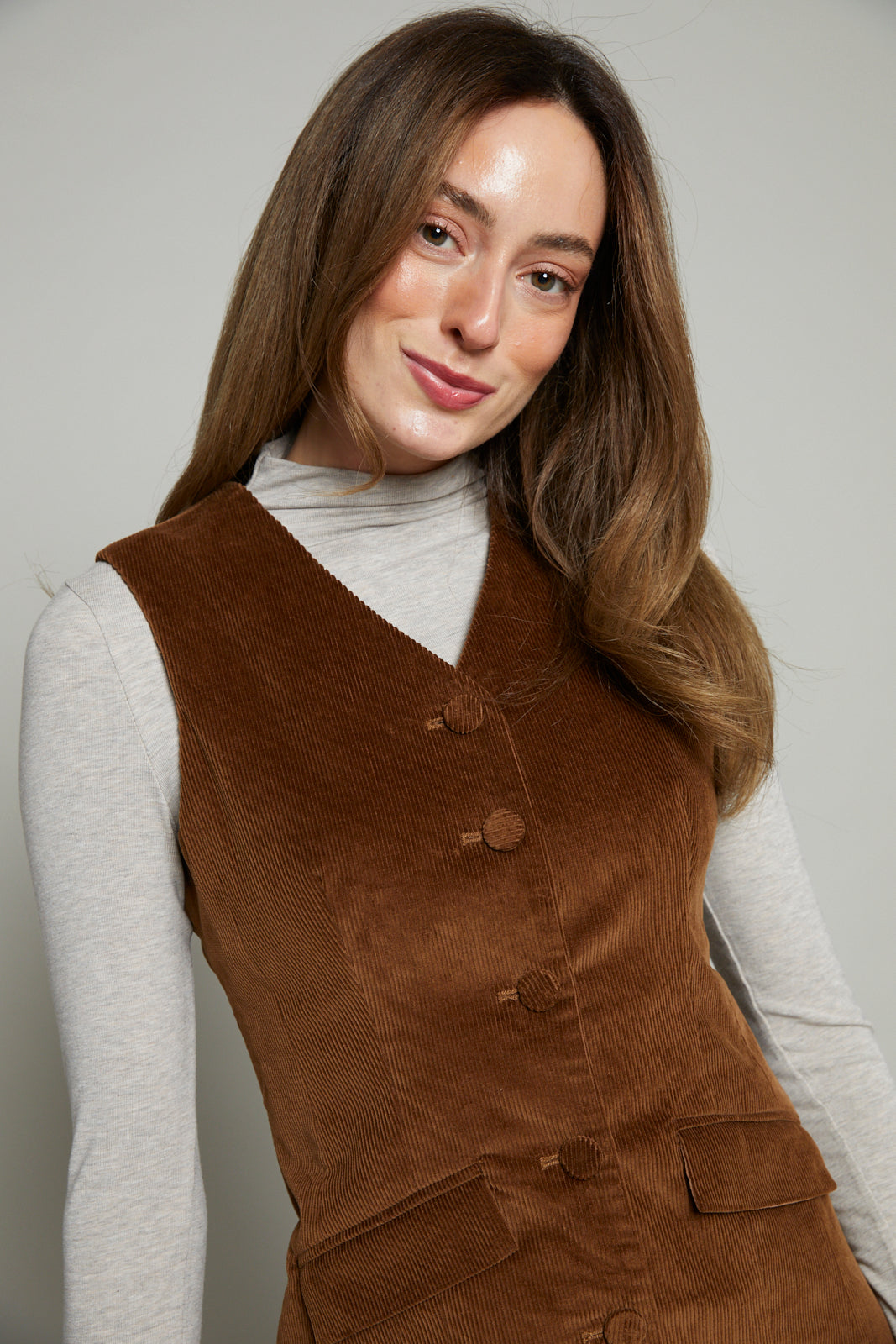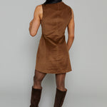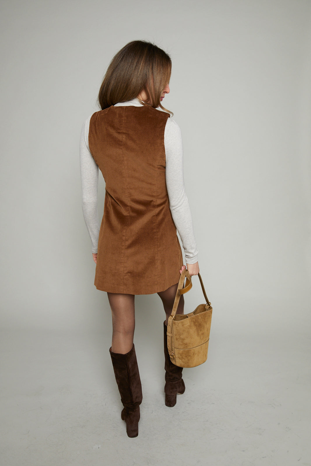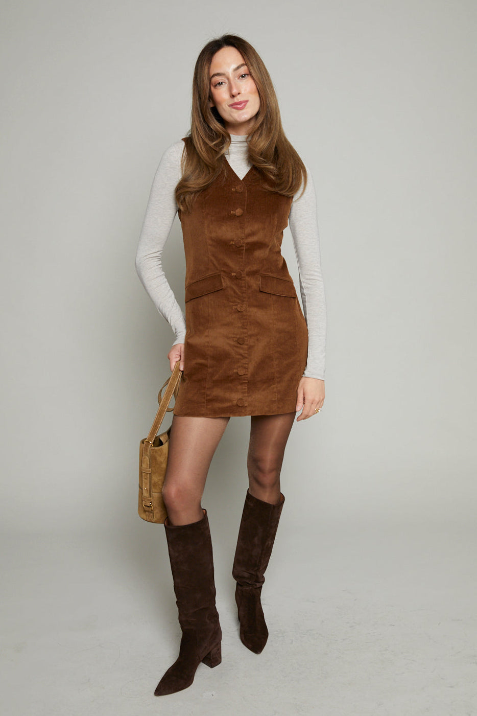 A playful mini corduroy design in the perfect camel shade for fall! Its sleeveless vest-style top and v-neckline create a relaxed, easygoing vibe, while the button-down front adds a touch of classic charm.