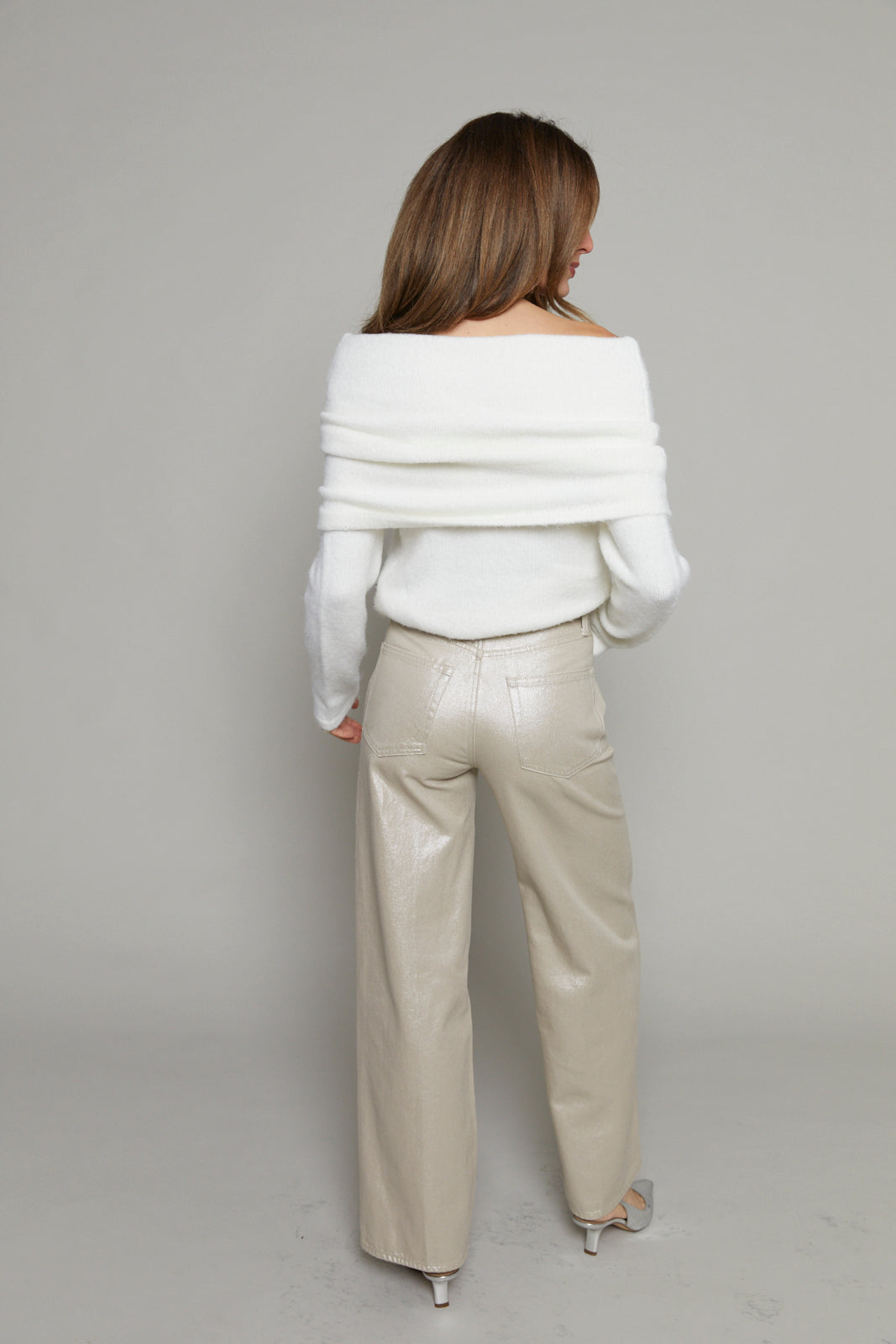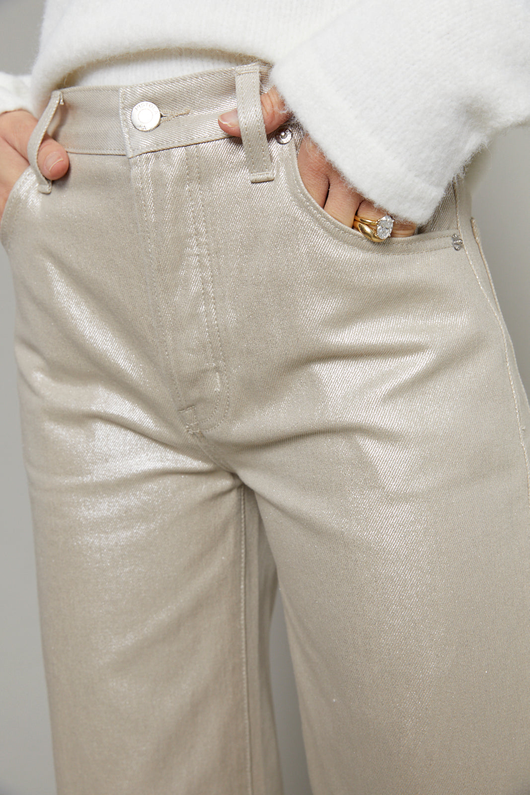 A signature shape, Tommy features a high rise, bowed wide leg, and full-length 32" inseam that creates elegant movement and modern proportion. Crafted from 100% cotton non-stretch denim in Champagne Luster, a pearly coated finish that reflects light with every step for an effortlessly elevated look.