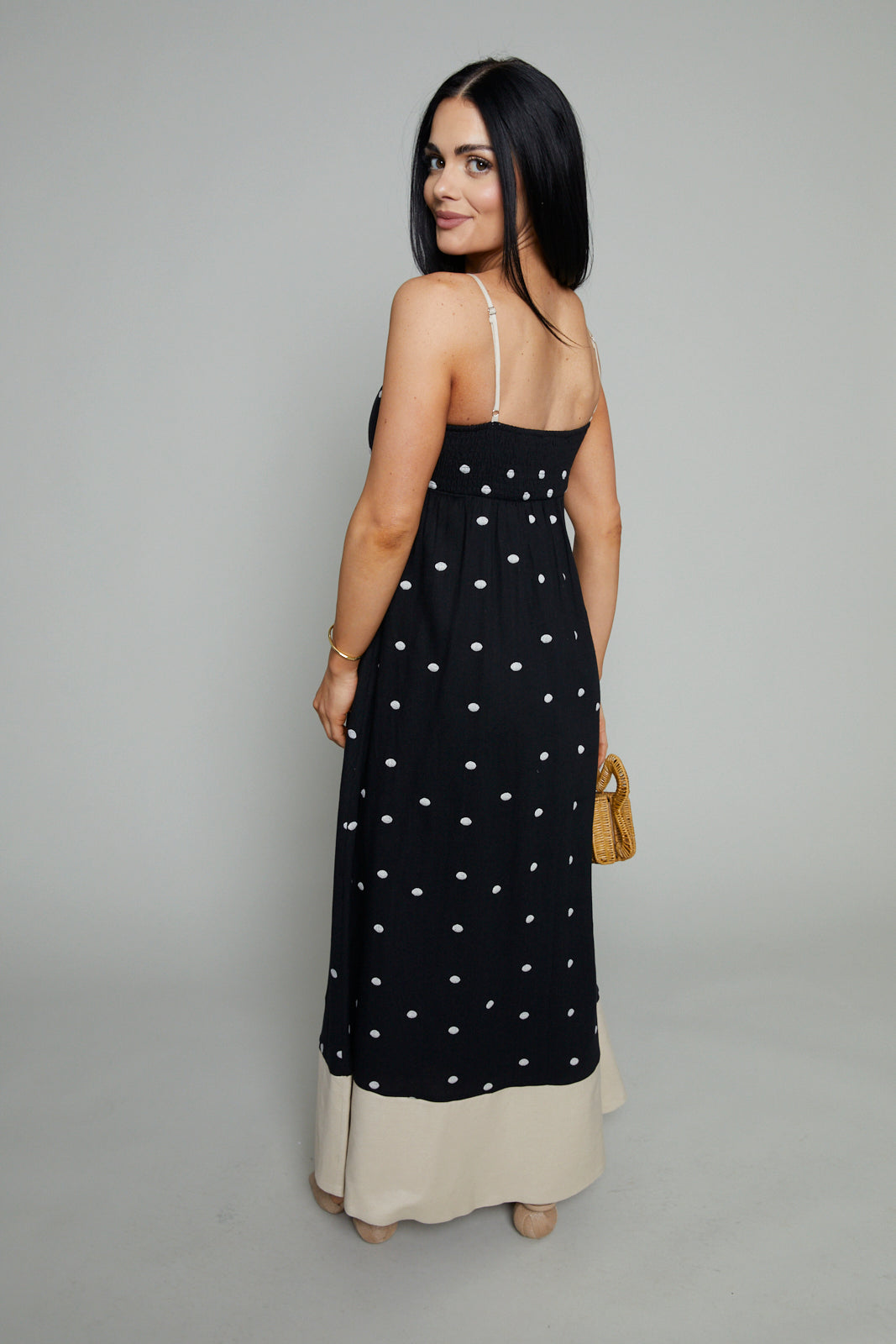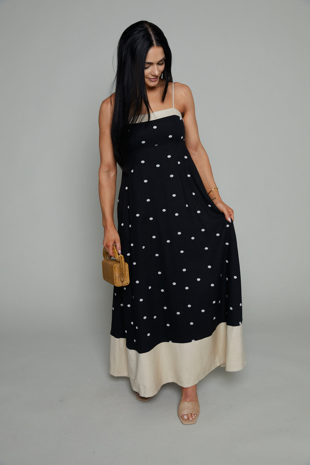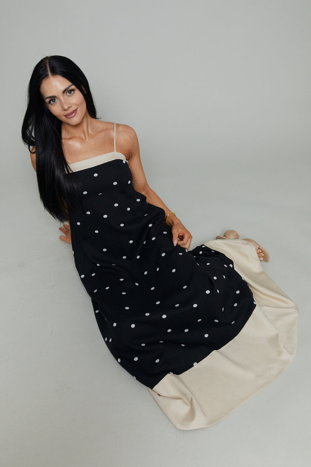 Polka dot maxi dress with spaghetti dress and color block contrast bottom