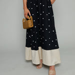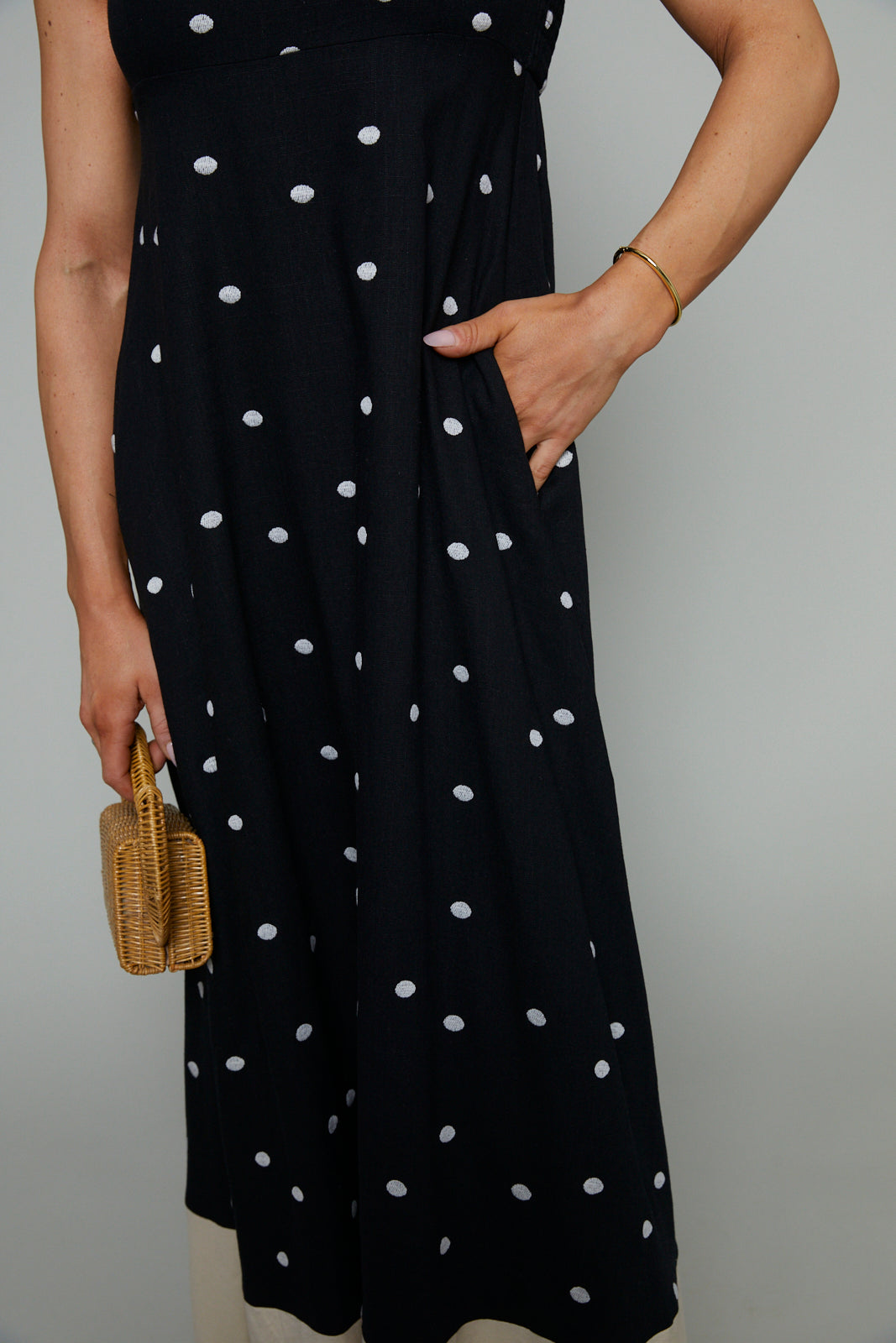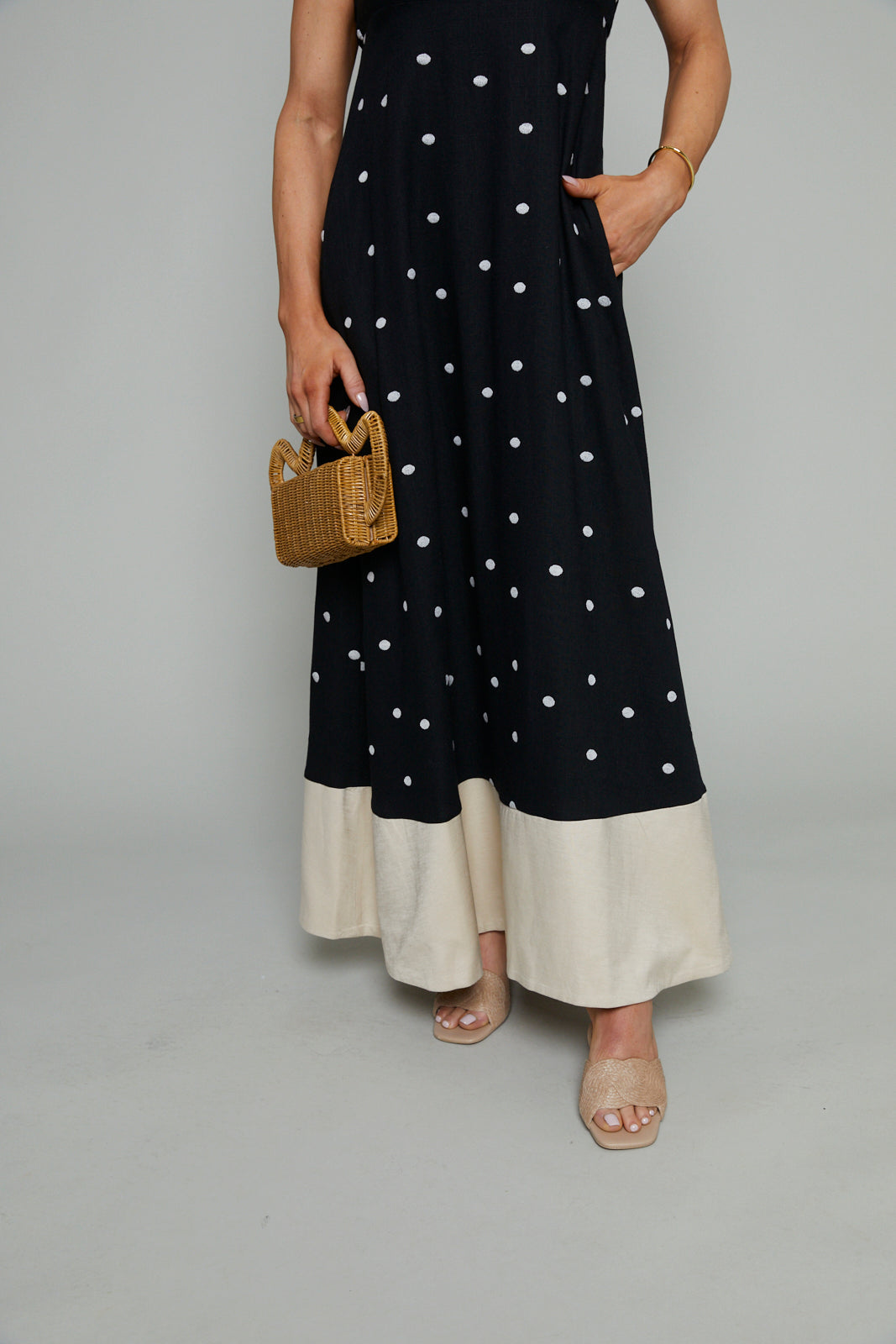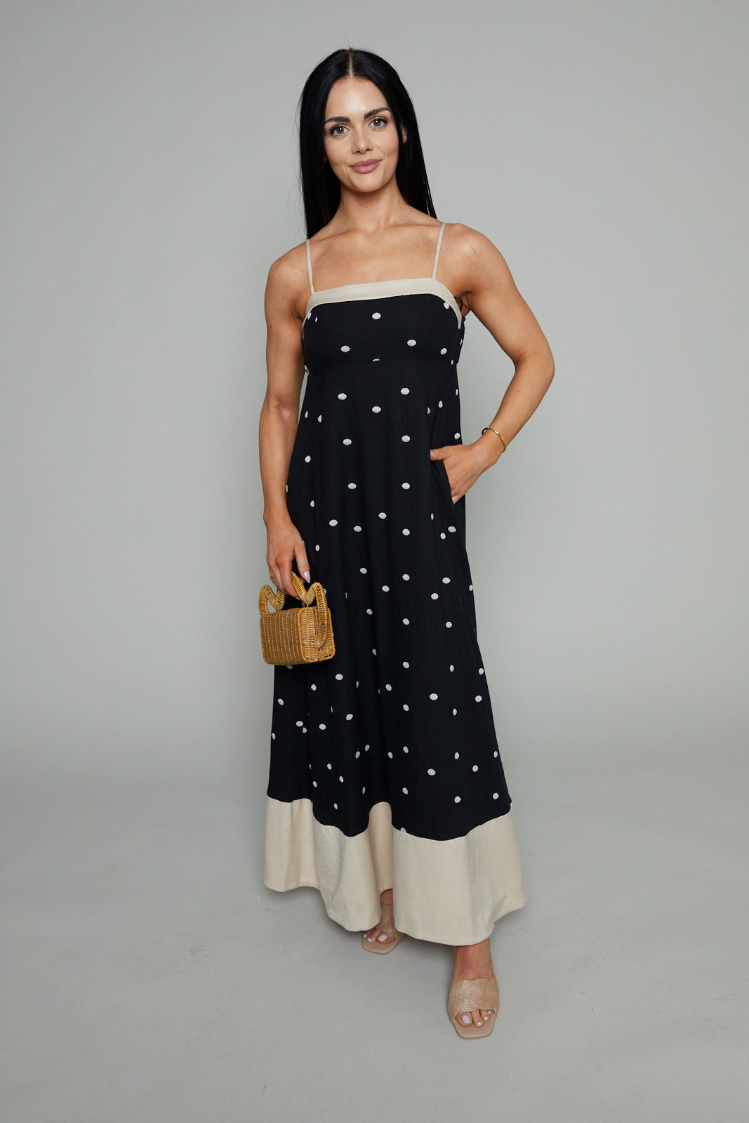 Polka dot maxi dress with spaghetti dress and color block contrast bottom